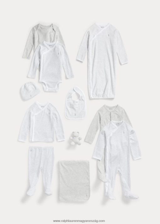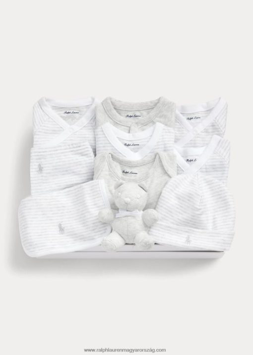Kitűnő ajándék várandós szülőknek: ez az alapvető dobozos készlet két lábú kezeslábast, egy felsőt koordináló nadrággal, egy ruhát, két bodyt, egy sapkát, egy vállpántost, egy plüssmacit és egy takarót tartalmaz. amelyek prémium pamutból készülnek.
