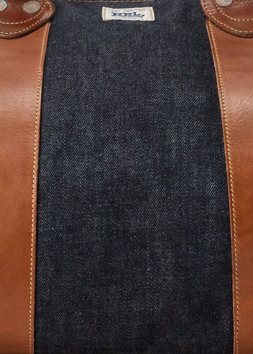 Indigófestett farmerből készült, amely használat közben idővel kifakul. ””hosszú r’rrl” felirat az elején. olajozott durván velúr alap. bőr fogantyúk és kárpitok. sárgaréz cipzár bőr húzóval. szorult réztónusú szegecsek.
