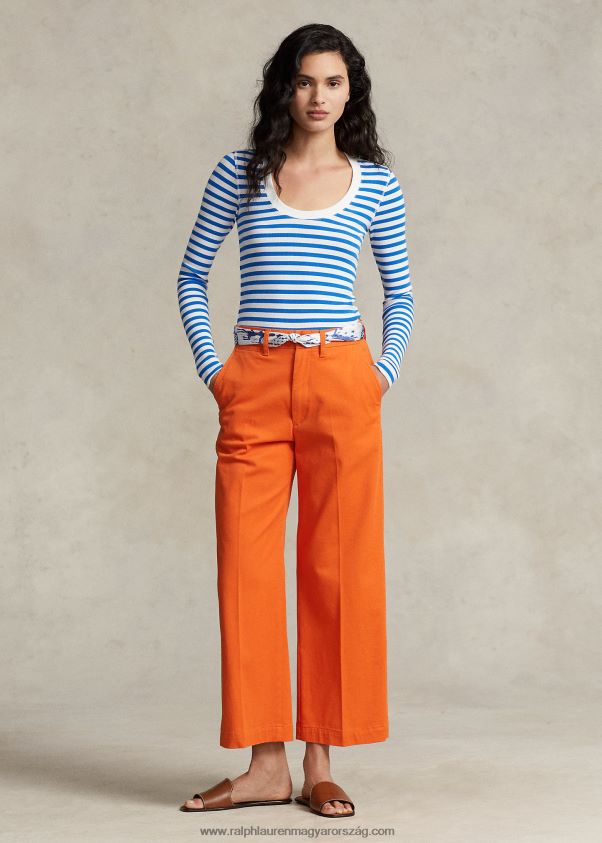 A sztreccspamut keverékkel finoman bordázott hosszú ujjú póló vékony szabású, és vízszintes fonallal festett csíkokkal rendelkezik. jellegzetes hímzett pónink ikonikus megjelenést kölcsönöz a jobb szegélynek.
