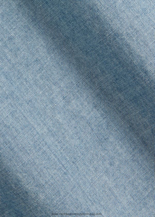 ez az ing Japánból származó indigófestett chambray-vel készült, és valódi gyöngyház gombokkal van kiegészítve. a bal mandzsettánál az ikonikus pólópóni látható.