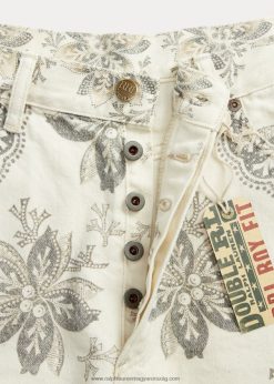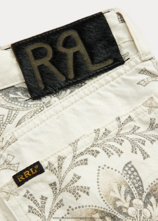 9,3 uncia-ból készült. japán magvas természetes pamut farmer. A jobb oldali twill gyűrűs fonású pamutból készült, és bandanna ihlette motívumokkal van nyomva. kopott szegélyek. a zsugorodás minimalizálása érdekében sanforizált.