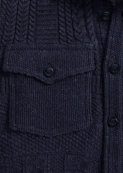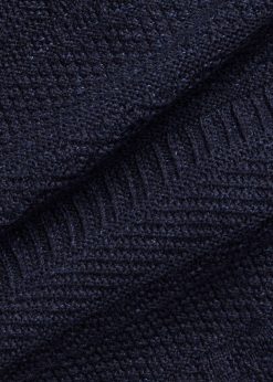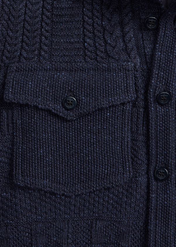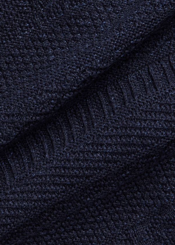 kötött pulóverruha gyapjú és pamut fonalak keverékével. a ’40-es évek felesleges ruhadarabjai ihlették. bonyolultan kötött guernsey-mintával, különféle öltések felhasználásával. ingruha sziluettje hegyes gallérral, gombos elől és ingfarkú szegéllyel. belső sávos megerősítésekkel és horgonyzó gombokkal lett befejezve. önövvel jár.