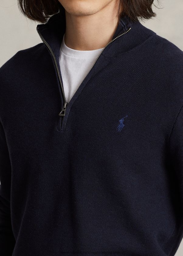 hálós kötött pamut negyedcipzáras pulóver 268048509 férfiak Ralph Lauren sötétkék hanga