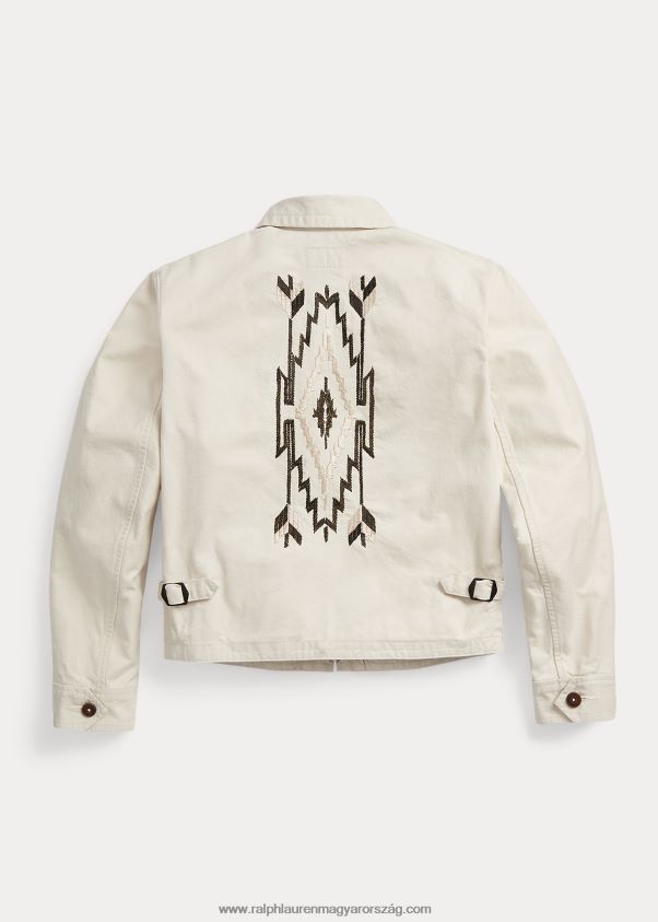 Vágott kabát könnyű pamut szövött anyagból. geometrikus hímzés a test elején és hátulján. a gallérnál, az ujjakkal, a zsebekkel és a csatos oldalsó fülekkel készült. teljes cipzáros elől. béleletlen.