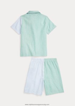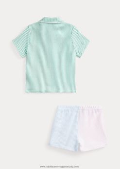 Bizonyára a kedvencek közé tartozik ez az alvó szett egy pamut dzsörzé pólót és pasztell csíkokkal nyomott szőtt twill rövidnadrágot.