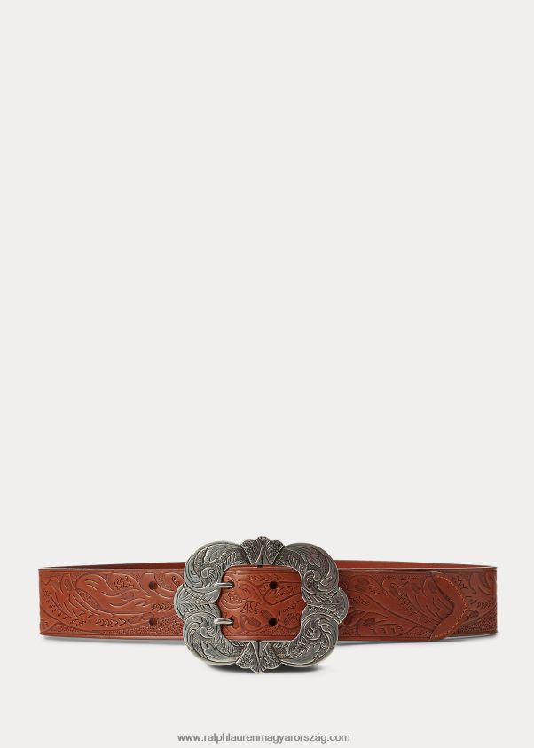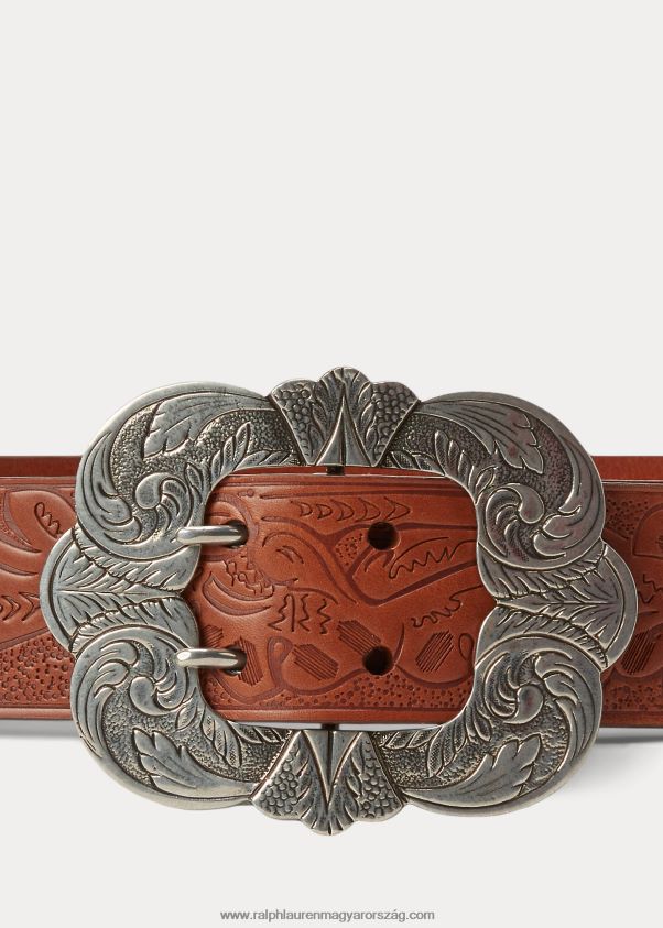 A vajas vachetta bőrből gyönyörűen kidolgozott, nyugati ihletésű öv kézzel van megmunkálva, bonyolult virágmintás jegyekkel, és egy gravírozott kétágú csattal van középre.