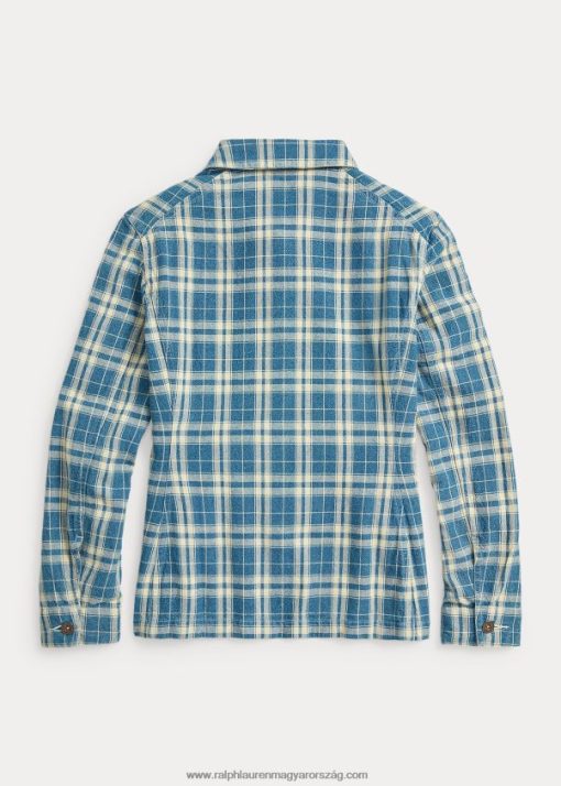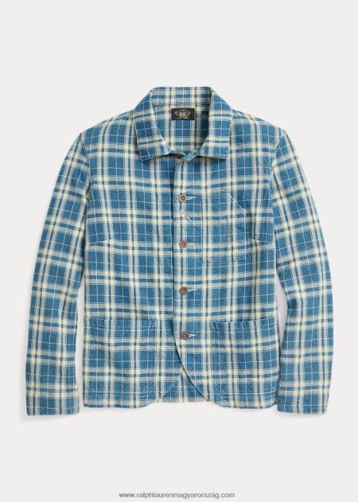 Rusztikus pamut-vászon anyagból készült könnyű kabát, amely indigóval festett fonalból készült. század elejéről származó munkaruha-ruhák ihlette részletek. szorongatott fémgombok. erősen mosott a napfénytől fakó megjelenés érdekében.