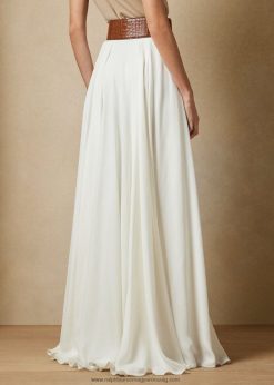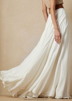 Modern esti stílus, a varrás szoknya tágas, padlót söprő sziluettre vágott, és oldalsó varrászsebekkel van felszerelve. Olaszországban készült, ez a fényűző stílus matt szaténból készült, amelyet speciálisan mosnak, és a kiváló kendő és finom, csiszolt fénye miatt választottak ki.