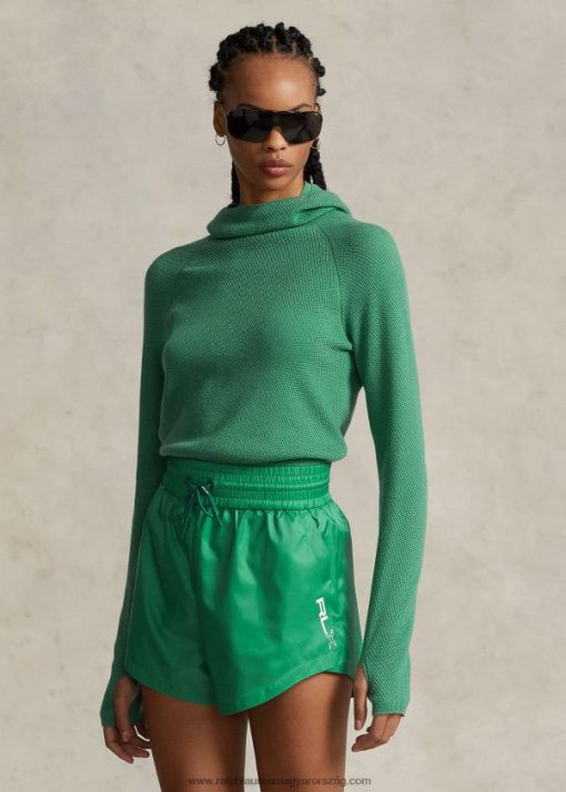 A puha, szezont átívelő merinó gyapjúból készült sportos pulóver snood kapucnival és hosszú raglán ujjal rendelkezik, hüvelykujj lyukakkal a mandzsettáin. A szegélynél ”rlx” hímzett a jellegzetes befejezés érdekében.