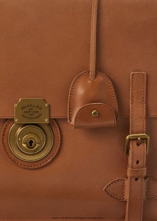 A teljes kiőrlésű nyeregbőrből készült és az ikonikus pólóörökség-foltunkkal díszített aktatáska antikolt sárgaréz bevonattal ellátott jellegzetes hardverelemekkel rendelkezik, beleértve az elülső logóval részletezett zárat és egy összehangolt bőr kulcscsengőt.
