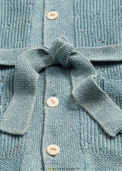 Indigófestett pamut- és lenfonalakkal kötött. rácsos öltésekkel díszített kendőgallér, sál, mandzsetta és szegély. mosott, színezett és javított. folyókagyló gombok. önövvel jár.