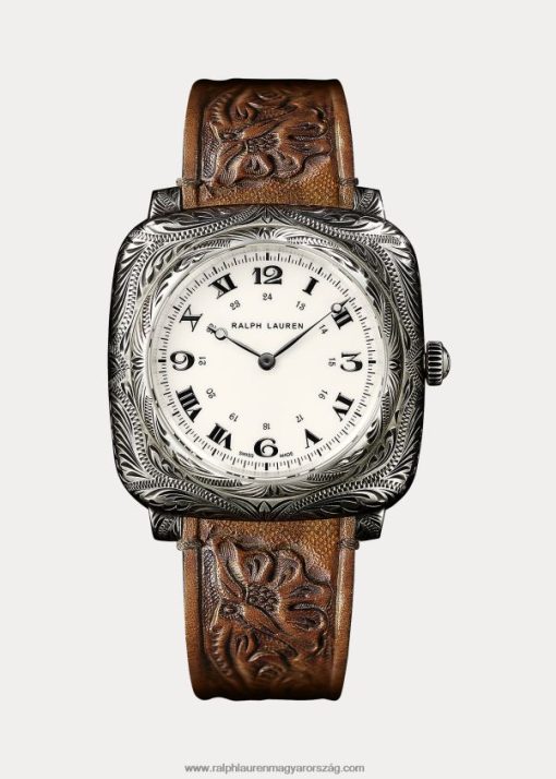 Az amerikai western órakollekció egy limitált példányszámban készült, kézzel készített órák, amelyeket ralph lauren amerikai nyugat iránti szeretete ihletett, és megragadja a vintage rodeó- és kagylóövek hiteles szellemét és egyéni karakterét, mr. Lauren visel, ami gyakran befolyásolja a terveit. Az antikolt ezüstből öntött, 42 mm-es párnatokja az 1930-as és ’40-es éveket idéző kifinomult forma, és a piaget által a ralph lauren számára készített, 21 600-as frekvencián futó rl514 önfeltekercselő kaliberű mechanikus szerkezet hajtja. rezgések óránként, 26 ékszerrel, körülbelül 40 órás teljesítménytartalékkal. az órát egy vintage ihletésű törtfehér számlap díszíti, kézzel nyomott római és arab számokkal – ez a kombináció a ralph lauren márkára jellemző – és breguet stílusú mutatók egészítik ki. A megjelenést a jellegzetes bőrszíj teszi teljessé, amelyet texasban kézzel szerszámoznak, és Olaszországban políroznak, míg a fémház és a csat kézzel gravírozott és korszerűd New York Cityben.