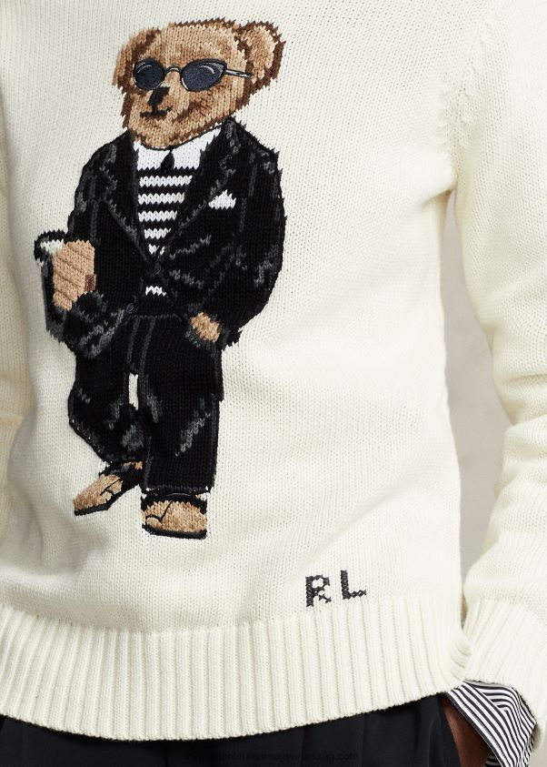 Ezen a szűknyakú pulóveren szeretett pólómackónk intarziakötésű és hímzett ábrázolása látható. itt bújós kabalafiguránk a szezon modernizmusát és könnyedségét mutatja be egy meleg időjárási öltöny megjelenésével.