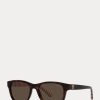 A polírozott acetátból készült, négyzet alakú napszemüveg belsejét csíkos mintázat jellemzi, a halántéknál pedig az ikonikus pólómaci színe látható.