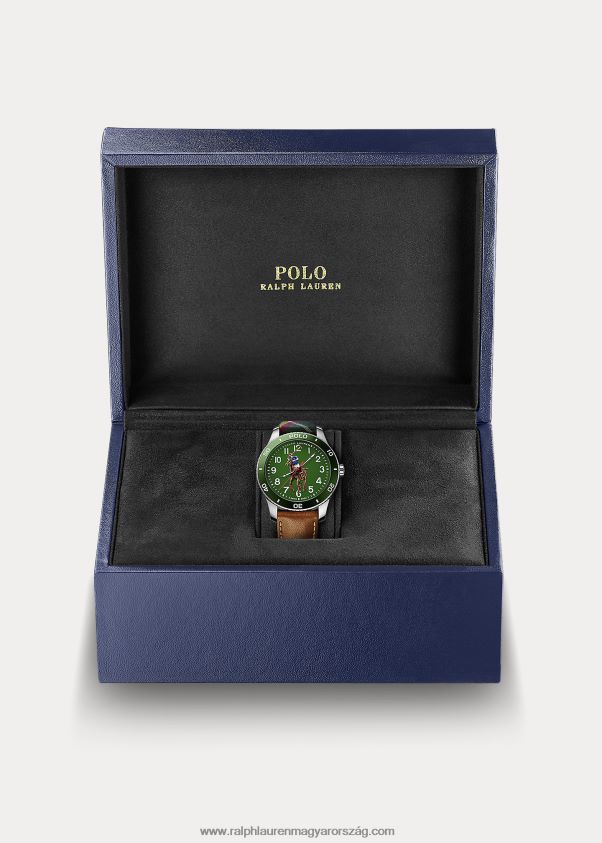 A lovassportok ereje és eleganciája által ihletett pólóóra kollekció művészien testesíti meg a pólómeccs nemzetközi kifinomultságát, ralph lauren ikonikus logójával, amely megörökíti az utolsó előtti pillanatot, mielőtt a kalapáccsal találkozik a labda, és félkövéren díszíti a számlapot. festői renderelés 3D-nyomattal több réteg színnel. ez a limitált kiadású óra rozsdamentes acélból készült, zöldre lakkozott számlappal rendelkezik a polo jellegzetes árnyalatában, és az rl200 kaliberű, svájci gyártmányú automata szerkezet hajtja. két cserélhető, 115 mm hosszú pánttal – barna borjúbőrrel és madras nyakkendővel borjúbőr hátlappal – szállítjuk, és számos további pánttal és karkötővel együtt is hordható, mindegyik külön kapható.