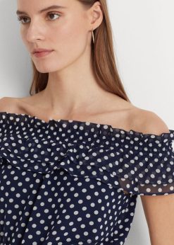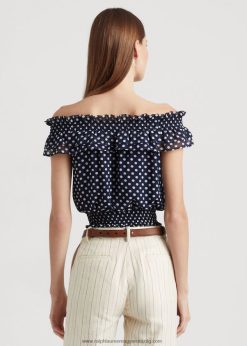 pöttyös vállból húzódó blúz 2680483961 nők Ralph Lauren sötétkék/krém