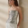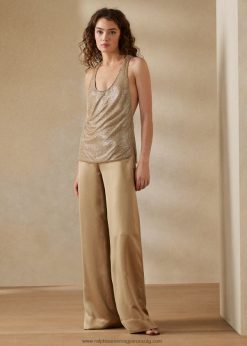 A modern luxust újradefiniáló olasz gyártmányú presling egy ujjatlan blúz sziluettjét dramatizálja réteges kidolgozással. először az alsó réteget lefóliázzák, hogy lenyűgöző pezsgős árnyalatot kapjanak. ezt követően egy aprólékosan gyöngyös tüll külső réteget rétegeznek a tetejére, ami egy fényes, elbűvölő dizájnt eredményez.