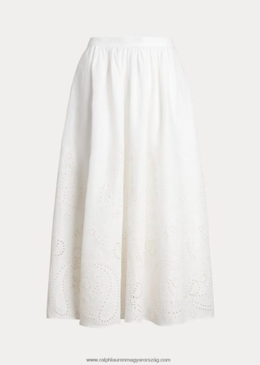 Vászonból készült fűzőlyukú hímzéssel, ez a midi szoknya a varrott derékrésznél ráncolást tartalmaz, hogy kiemelje a vonalas sziluettjét.