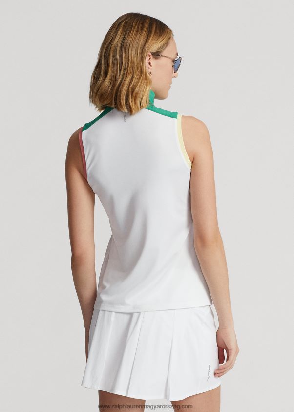 A jellegzetes pique hálóból készült, nagy rugalmassággal, ez a színes blokkolt pulóver ujjatlan, egyenes szabású, és guminyomattal ”rlx” logóval van ellátva.