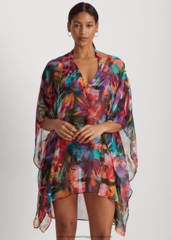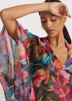 ezt a légies burkolatot a mély V-nyak, a folyékony tunika sziluett és a szezon trópusi virágmotívuma határozza meg.