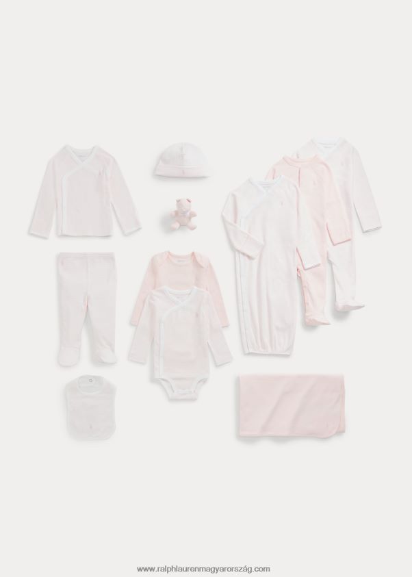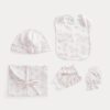 ez a 12 részes készlet a várandós szülők számára két lábú kezeslábast, egy felsőt koordináló nadrággal, egy ruhát, két bodyt, egy sapkát, egy vállpántost, egy kitömött macit és egy személyre szabható takarót tartalmaz. prémium biopamutból készülnek, és elférnek az összecsukható vászonkosárban.