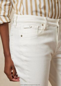 A 160 darab vékony farmerünket Olaszországban készítik, sztreccsbe integrált farmerből, amely Japánból származik, és amelyet fehérítettek, hogy elérjék a fehér árnyalatot. ezt a középen emelkedő stílust az érme zsebében egy bőr füllel, a hátulján pedig egy “ralph lauren” feliratú bőrfolt fejezi be, mindegyik antikolt arany tónusú szegecsekkel.