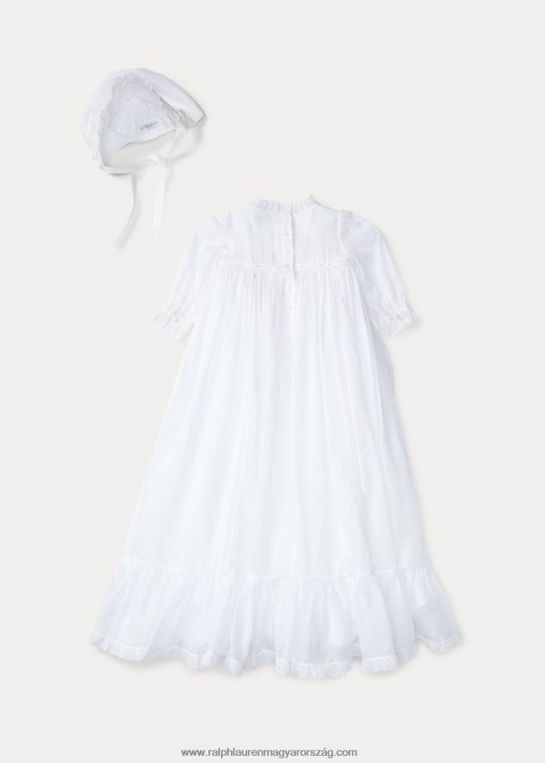 Exkluzív babakollekciónk része, ez a keresztelő készlet tökéletessé varázsolja különleges napját. egy gyönyörű pamut organza ruha, amely mindenütt csipke díszítéssel, egy hozzáillő motorháztetővel és egy tárolótáskával rendelkezik.