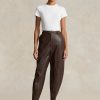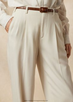 Ikonikus Stamford nadrágunk szélesebb szárú változata, az acklie a ralph lauren jellegzetes férfiruházati ihletésű női nadrágja, mivel elülső ráncokkal és éles lábráncokkal készült. gyapjú gabardin szövete, amelyet egy tisztelt olasz malomban szőttek, puha kezet és szép kendőt eredményez. a kis négyzet alakú csattal megemelt önöv határozottságot kölcsönöz a deréknak, míg a magas szabás erős nőies esztétikát idéz.