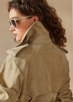 Az olasz gyártmányú baird, amelyet itt hagyományos trench kabát-részletekkel, köztük gombos vállpántokkal, viharlebenyekkel, csatos torokzárral, öves derékkal és kétsoros sziluettel készült, rugalmas, könnyű. báránybőr borjúlegeltető sziluettben. valódi szarvgombok és báránybőrrel bevont csatok hangsúlyozzák időtlen dizájnját.