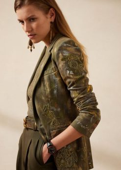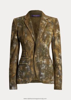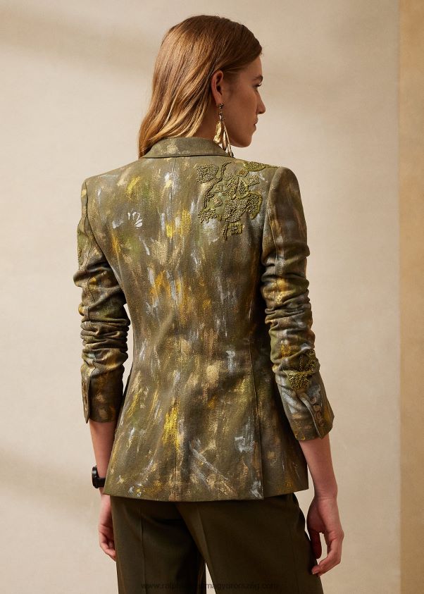 A camo print művészi értelmezése, a calan blézer idei szezonbeli megjelenése pamut farmerből készült, amely többlépcsős kézműves folyamaton megy keresztül. először is, a kabátot a szezon jellegzetes olívazöldre festették. ezután ezüst és arany ecsetvonások vannak kézzel festve az egygombos sziluettjén. Végül kézzel gyöngyözött virágfoltok kollekcióját kézzel alkalmazzák, így ez az időtlen blézer egyedülálló darab.