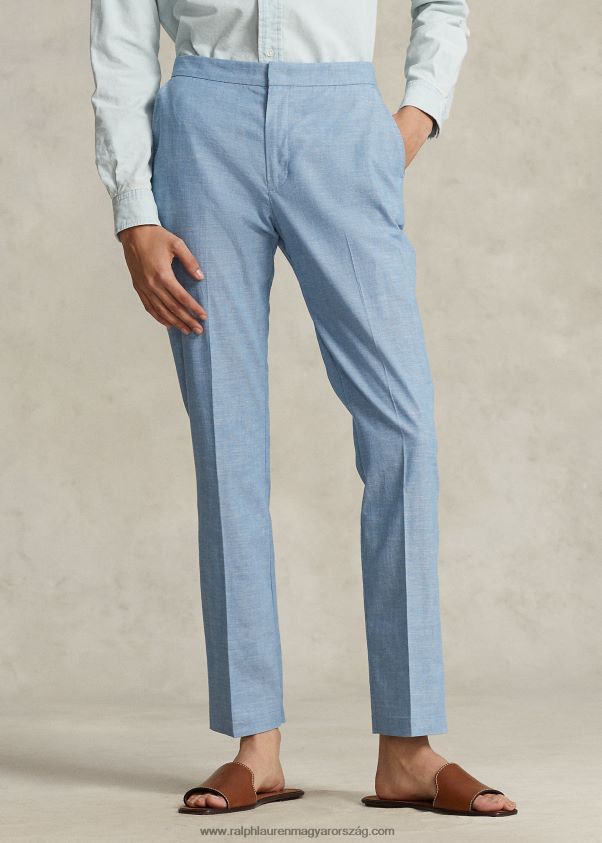 Ezt a nadrágot a kivágott, kigyulladt sziluetthez vágva, könnyű chambray színben tüntették fel, és minden szárán éles, férfiruházat-ihlette gyűrődések vannak.