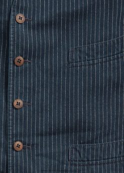 Japánból származó, csíkos halszálkás anyagból készült. kimosott az időszerű megjelenés érdekében. állítható csatos háttámla. bélelt. corozo gombok.