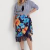 A kecses mozgás érdekében légies kreppből készült szoknyát a szezon tengeri ihletésű csíkos motívuma határozza meg.