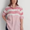 Fonallal festett tarka csíkok ütik ki ennek a vászoningnek a szellős, túlméretezett sziluettjét, ami a meleg időjárási szezon kötelező stílusát alkotja. a tekercses ujjak felerősítik az alkalmi vonzerőt, míg Lauren hímzett logója a mellkason ikonikus hatást ad.