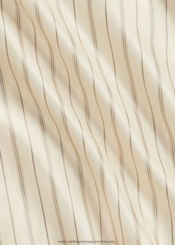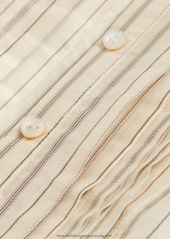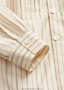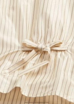 könnyű eperfa selyemből készült, antik ihletésű csíkos mintával. egy 1910-es évekbeli blúz ihlette. Elől redőzött kantárral és hátul derékrészen önkötővel tervezték. valódi gyöngyház gombokkal lett kiegészítve.