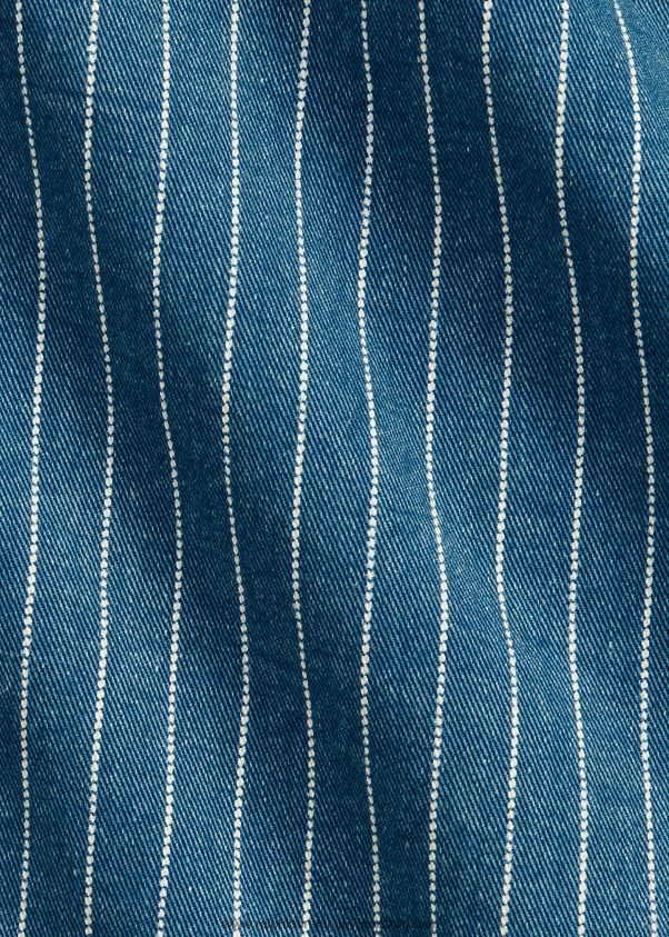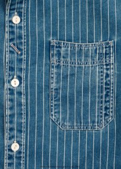 Japán pamut twillből készült. igazi indigóval festve és pöttyös-csíkos motívummal nyomva. szalaggalléros. Az oldalvarrásnál autentikus lefolyó láncvarrás konstrukció, mely a ’20-as, ’30-as évek munkaingjein alapul. belső részen muszlin megerősítések. erősen kimosott, az időtálló megjelenés érdekében. folyókagyló gombok.