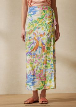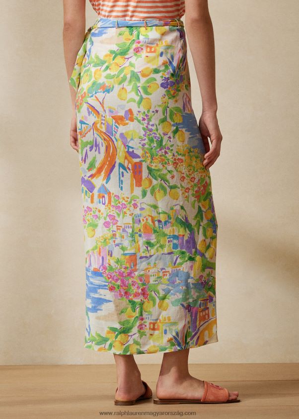a sarong ihletésű danyelle szoknya üdülőhelynek megfelelő változata vászonból készült, amelyet a szezon egyedi grafikájával nyomtak – ez a motívum, amelyet először festettek, majd nyomatként reprodukáltak, és egy óceánpart lenyűgöző tájait ábrázolja. olasz falu. A hátul éles dartsokkal szabott, bokáig nyúló maxi stílus aszimmetrikus szoknyafedővel rendelkezik, amely a deréknál önkötőbe gyűlik össze, és minden lépésnél felfed egy csipetnyi lábszárat.