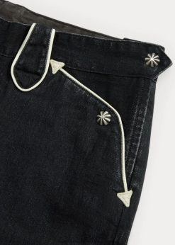 10 oz-ból készült, közepes méretű rövidnadrág. japán sztreccs farmer. jobb oldali twill fekete mosással. 1950-es évek ihlette western stílusú részletek. kontrasztos csövek az övhurkoknál és a zsebeknél. ezüst tónusú fémpattintással fejezték be.