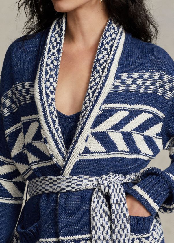 Pamut-vászon keverékkel kötött ez a kendős galléros kardigán kéttónusú geometrikus csíkokkal, amelyek kombinálják az intarzia és a jacquard kötési technikákat. kockás motívumú, derekat meghatározó önövvel párosul.