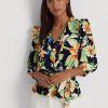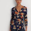 A könnyű pamutkeverék dzsörzéből készült, peplum felsőt a válltól elzárt sziluett és a könnyű önkötő öv jellemzi. pezsgő fodrok és elegáns virághímzés fokozza nőies vonzerejét.