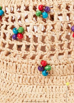 A vödör sziluettjének kézműves megjelenése, ez a raffia sapka koronájánál áttört öltésekkel horgolt, és színes fagyöngyökkel díszített.