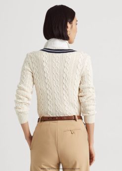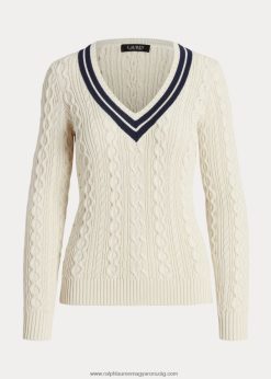 kábelkötésű krikettpulóver 2680484378 nők Ralph Lauren mascarpone krém/tengerszín
