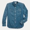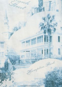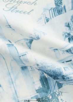 vászon és pamut keverékéből készült. A tónusos-kék nyomat festői kilátást nyújt Dél-Karolinára. két foltos zseb a mellkason. vintage ihletésű gombok.