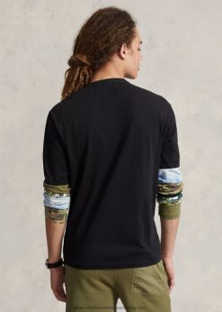 A slub pamutdzsörzéből készült póló patchwork ujjakkal rendelkezik, amelyek terepszínű és trópusi mintás motívumokat tartalmaznak. A ralph lauren jobb gyapottal együttműködve javítja a gyapottermesztést világszerte. a jobb gyapot arra tanítja a gazdálkodókat, hogy hatékonyan használják fel a vizet, gondoskodjanak a talaj és a természetes élőhelyek egészségéről, csökkentsék a legkárosabb vegyszerek használatát, és hajtsák végre a tisztességes munka elveit.