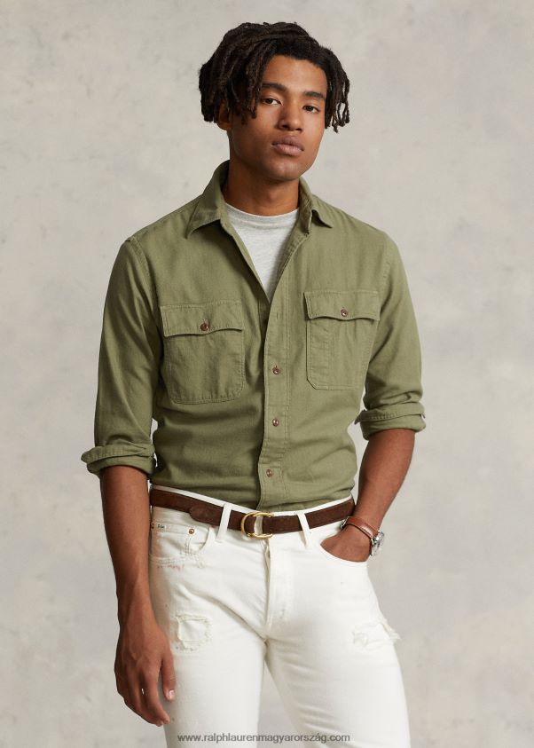 Ez az ing a munkaruha ihlette sziluettet ötvözi a pamut twill-szel, amely kefés a nagyobb puhaság érdekében. A ralph lauren jobb gyapottal együttműködve javítja a gyapottermesztést világszerte. a jobb gyapot arra tanítja a gazdálkodókat, hogy hatékonyan használják fel a vizet, gondoskodjanak a talaj és a természetes élőhelyek egészségéről, csökkentsék a legkárosabb vegyszerek használatát, és hajtsák végre a tisztességes munka elveit.
