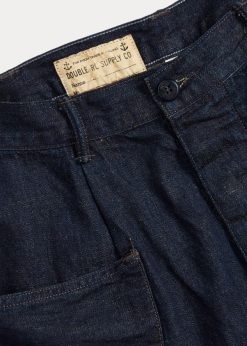 8 oz-ból készült. pamut-vászon farmer, amelyet Japánban szőnek. részleteket a ’40-es évek felesleges ruhái ihlettek. gombos légy. összecsavart visszacsatolás.