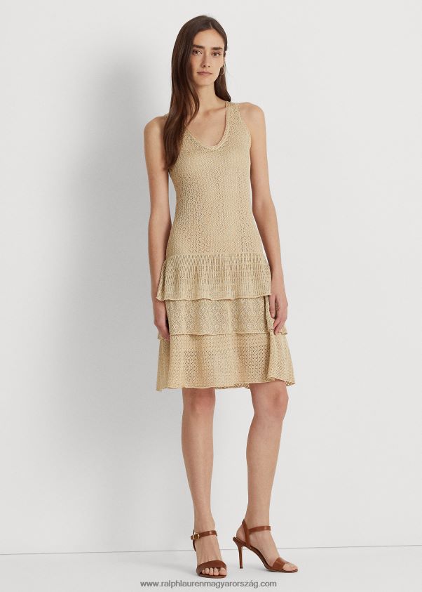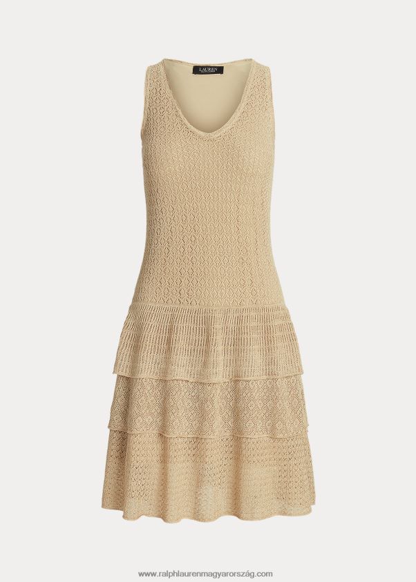 A pointelle kötött minta kiegészíti ennek a ruhanak a lehajtható derekú sziluettjét, amely könnyű vászonkeverékkel készült, csillámos csillogással az elegáns megjelenés érdekében. a nőies, fodros szegélyű lépcsőzetes szoknya könnyű mozgást kölcsönöz.