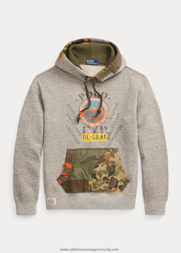 ez a pamutkeverék kapucnis pulóver masszív póló megjelenést kölcsönöz jellegzetes sablonozással, kontrasztos foltokkal és mindenhol javítással.