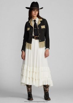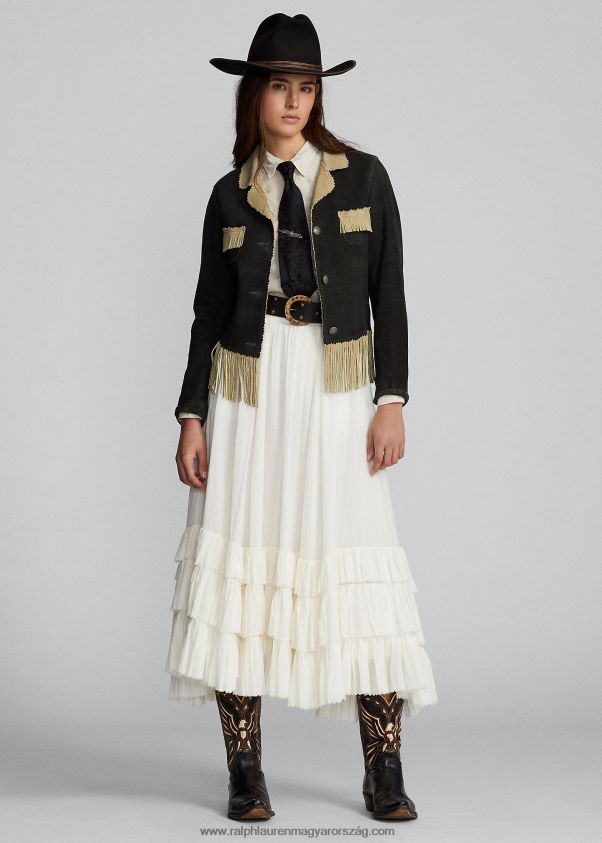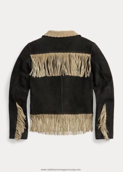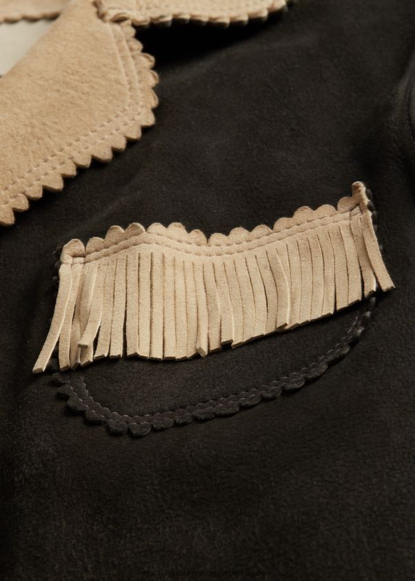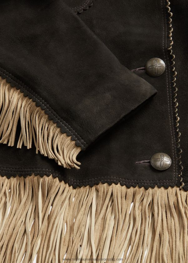 könnyű velúrból készült kabát. velúr oldala kifelé néz, a belsejében teljes bőr. rojtos díszítés a zsebeknél, a mandzsettáknál, a hátsó szegélynél és a szegélynél. csipkézett élek a gallérnál és a zsebeknél. twill a járom felé néz. az ujjaknál bélelt. ezüst tónusú fémgombokkal készült.
