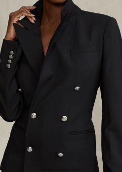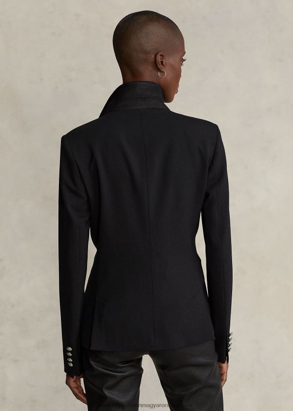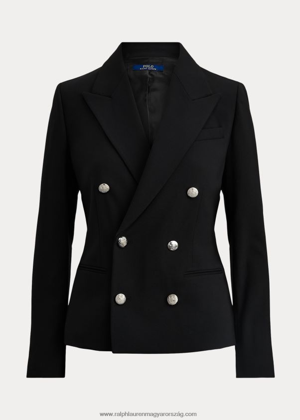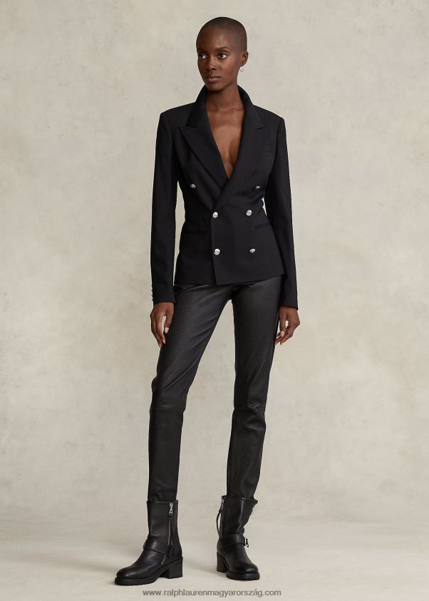 Egy csipetnyi nyúlású, pazar gyapjúból készült, csiszolt blézer férfiruházati ihletésű hajtóka és kétsoros sziluett.